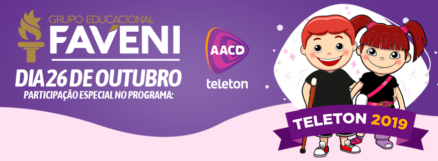 O Grupo Educacional FAVENI vai apoiar a campanha Teleton 2019, da AACD. O Teleton neste ano será realizado nos dias 25 e 26 de outubro, com transmissão pelo SBT.